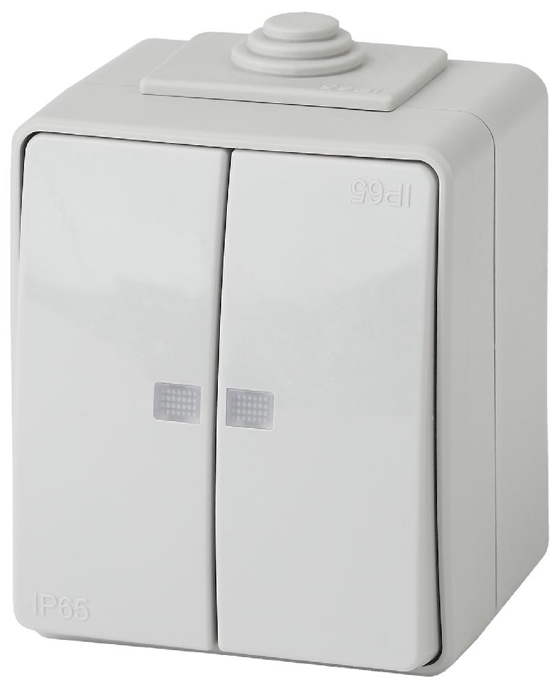 Выключатель влагозащищённый 2-клавишный с подсветкой серии Эра Эксперт накладн IP65 цвет серый 11-1605-03. Номинальные характеристики 10А 250В . Выполнен из качественного поликарбоната, оснащён уникальными винтовыми клеммами ЭКСПЕРТ для максимально качественного зажима кабеля в механизме.