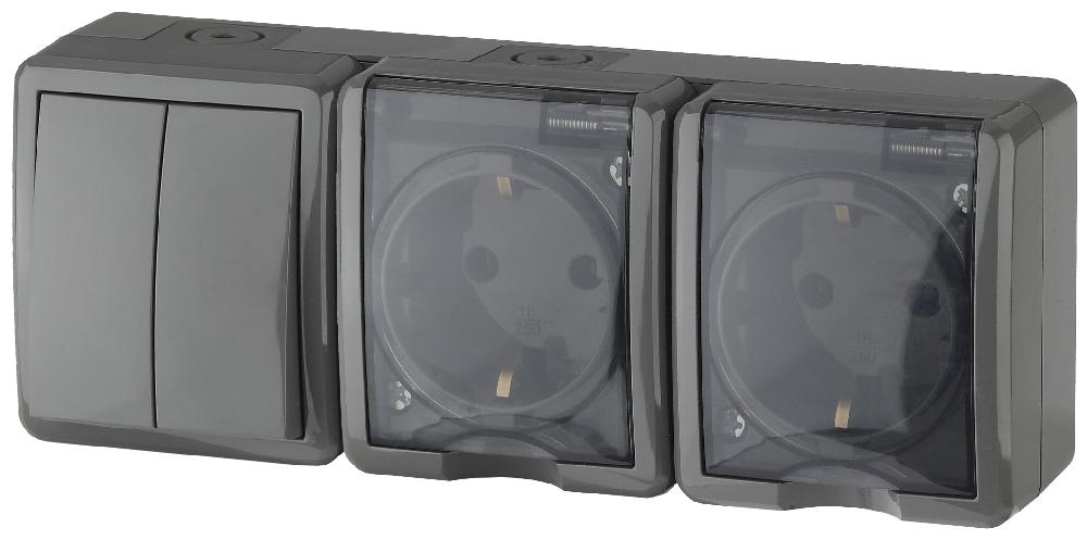 11-7404-03 ЭРА Блок две розетки+выключатель двойной IP54, 16A(10AX)-250В, ОУ, Эра Эксперт, серый (5/
