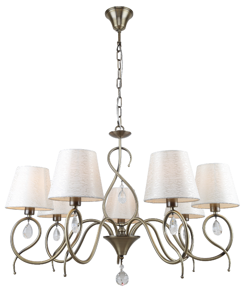 Rivoli Beatrix – коллекция классических люстр и бра для гостиной, спальни, загородного дома, ресторана, гостиницы. Артикулы для поиска: 2067-305, 2067-307, 2067-401. Коллекция создана итальянскими дизайнерами. Её отличительные особенности: декор в виде хрустальных подвесок, окрашивание металлического корпуса в цвет античной бронзы, рожки в виде завитков с плавными формами, белые тканевые плафоны в формате абажуров. Данная люстра потолочная под 7 ламп Е14 40 Вт освещает площадь до 21 м2. Подвес люстры можно отрегулировать по высоте при монтаже на потолок. Ткань плафонов грязестойкая, не собирает пыль и легко моется. Дизайн элегантных рожков люстры напоминает узелки. Корпус из прочного лёгкого металла. |